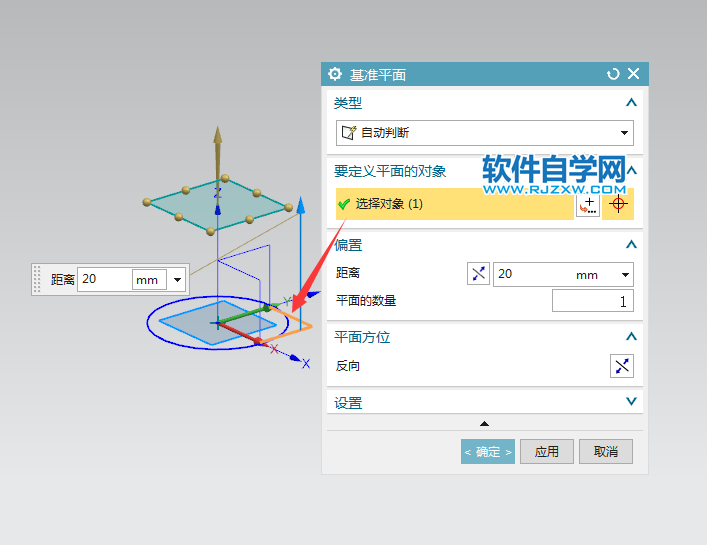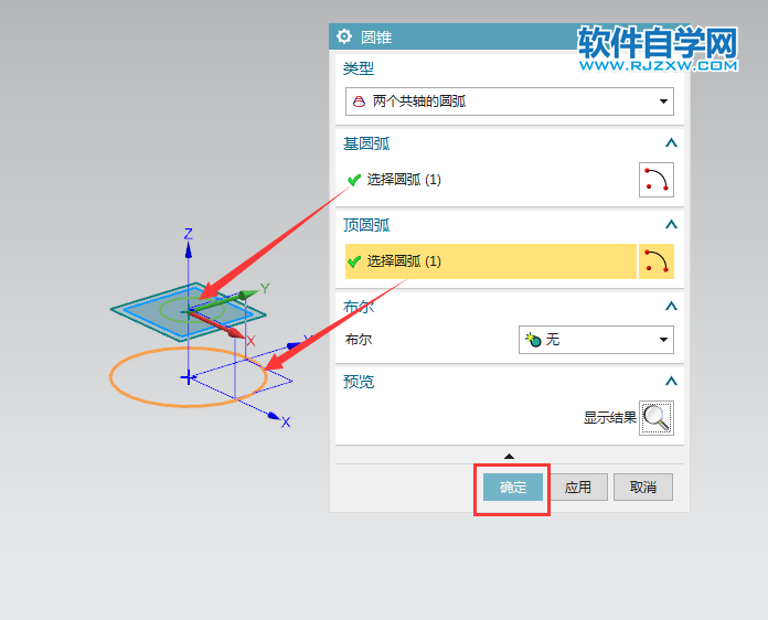 7、基圆弧选择小圆出来,顶圆弧选择下面的面。效果如下: