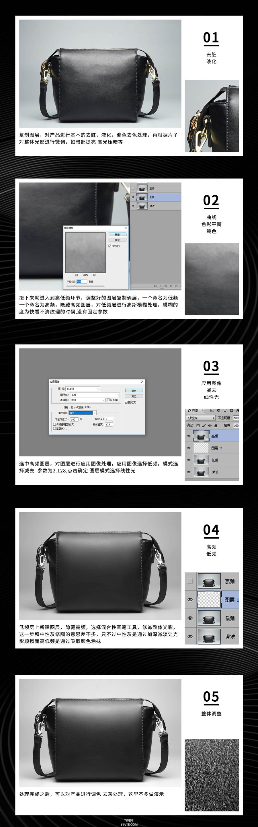 产品前期拍摄会因为诸多原因导致光影杂乱,褶皱明显,通过高低频可以很好的把纹理和颜色区分开来,通俗点可以把低频说成是颜色层,高频说成是纹理层 通对低频也就是颜色层进行处理光影自然变得顺畅,对高频也就是纹理层进行处理产品自然变得平滑。