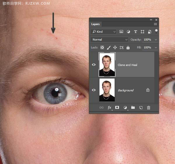 | 二、修整素材: 1、打开年轻人肖像图,然后对原素材图层进行复制(选择“图层>新图层>复制”)。选择污点修复笔刷,将下图所示的小伤口修复。 |