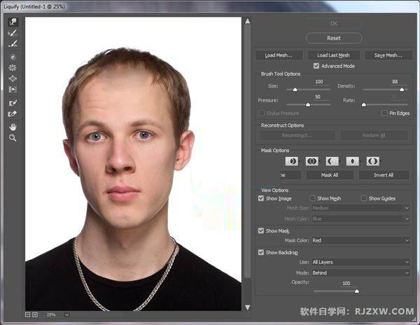 | 三、调整面部骨架: 1、在应用液化滤镜前,需要进行一些准备工作,由于液化滤镜不好掌握,需要花点时间去调整的。由于应用滤镜,并且调整比较多,所以使用智能滤镜会是一个不错的选择。在主菜单中选择“图层>智能对象>转为智能对象”,然后选择“滤镜>液化”,调出液化设置面板,记得勾选高级模式。 |