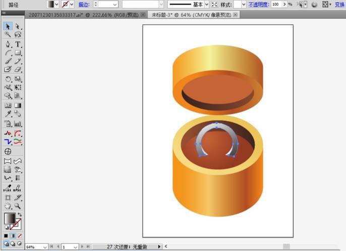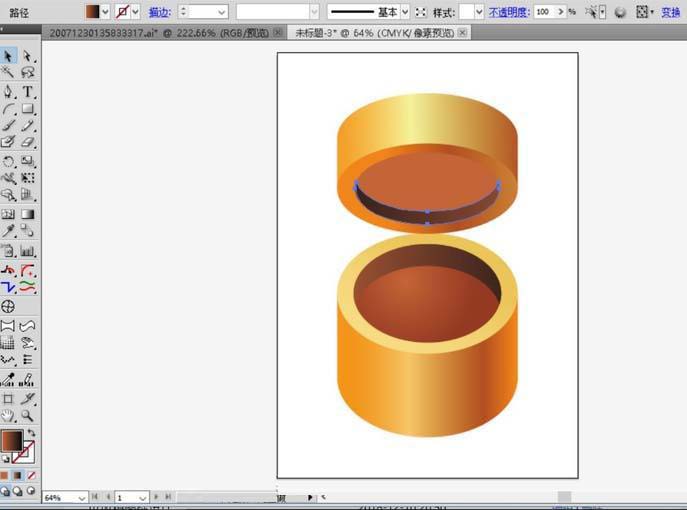 第1步、绘制一个矩形和一个椭圆,然后进行合并处理,并填充金铜色渐变。