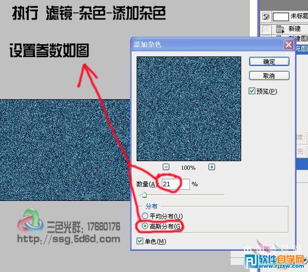 | 3、执行:滤镜 > 杂色 > 添加杂色,选择高斯分布,数量为:21%,参数设置如下图。 |