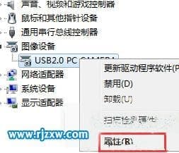 2、打开设备管理器后,找到你刚安装驱动的设备,然后右键点击“属性”(下面以摄像头为例,其他设备操作相同);