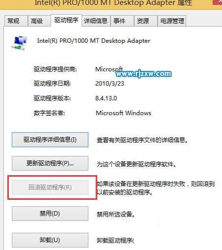 3、打开设备属性后,切换到“驱动程序”标签页,然后点击“滚回驱动程序”按钮;(如果没有更新过驱动,那么这个按钮将是灰色的无法点击);