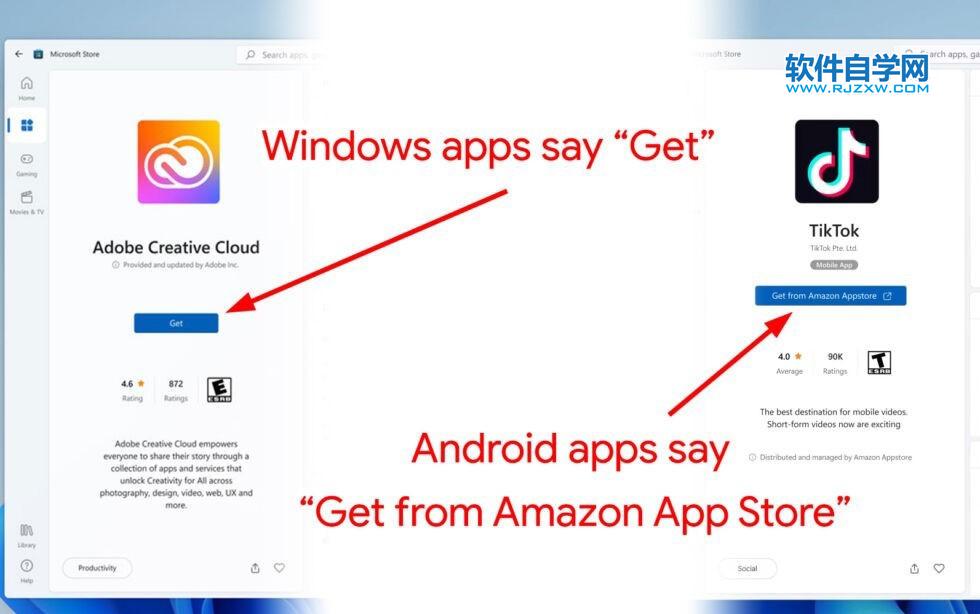 我们还没有亲眼看过在Windows11上安装安卓应用程序的完整过程,因此尚不清楚其中具体的运行模式。微软发布了几张截图,图片显示微软应用商店在推广亚马逊应用商店中的安卓应用程序。看起来亚马逊商店的应用程序评论、屏幕截图和说明会列在微软应用商店中,但微软应用商店似乎并不能真正安装安卓应用程序。关键就在这个“安装”按钮上。如果是Windows应用程序,按钮上显示的是“获取(Get)”,表明点了就会安装应用程序。但是如果是安卓应用程序,按钮上的内容完全不同――“从亚马逊应用商店获取应用程序(Get from Amazon App Store)”,还带有一个小框和一个箭头组成的小图标,表明点了会链接到一个外部的应用程序。