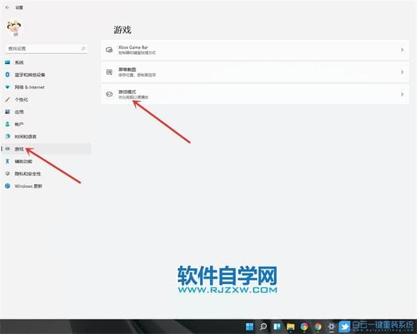 2、设置窗口,左侧点击游戏,右侧点击游戏模式。(优化电脑以便播放)