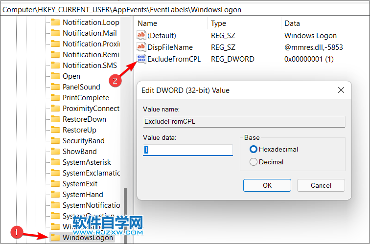 2、导航到以下键:HKEY_CURRENT_USER/AppEvents/EventLabels/WindowsLogon