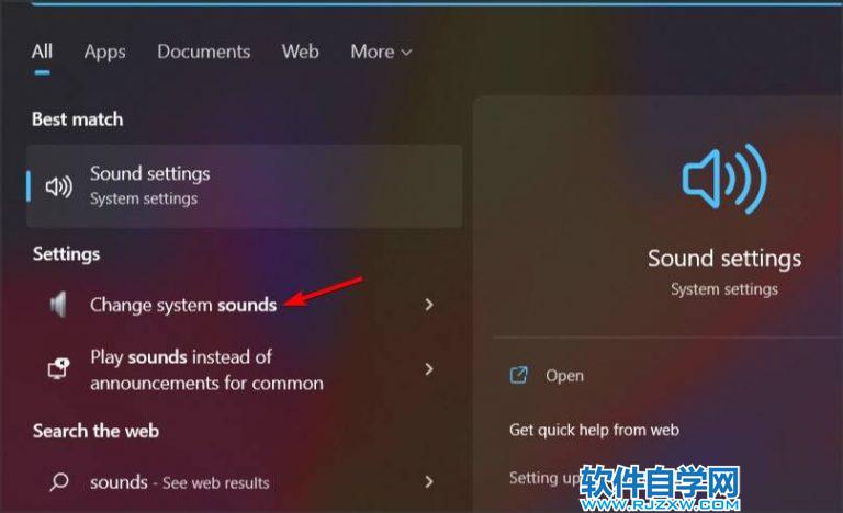 6、打开搜索并输入声音。从列表中选择更改系统声音。