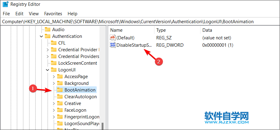 7、转到左窗格中的以下键: HKEY_LOCAL_MACHINESOFTWAREMicrosoftWindowsCurrentVersionAuthenticationLogonUIBootAnimation