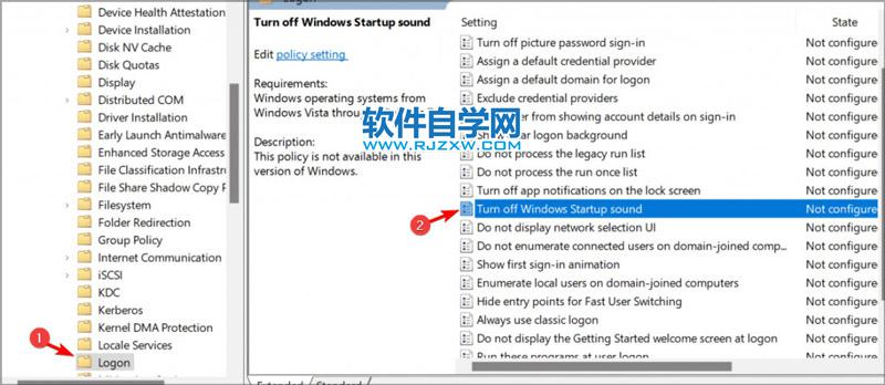 14、在右侧窗格中,选择关闭Windows启动声音。