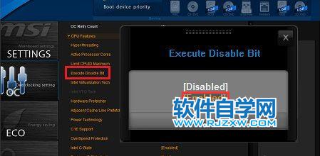 5、还有就是进入bios设置,依次点击“OC(超频)→CPU features(处理器属性)→Eexecute disable bit(执行禁用位)”,最后将其设置为“Enabled(启用)”即可。
