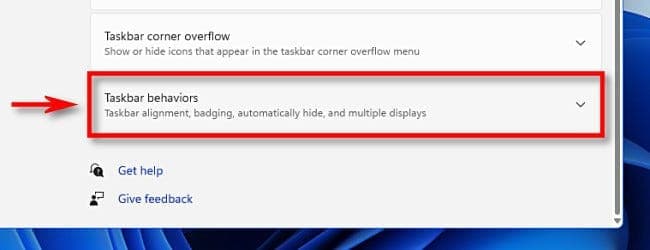 2、(或者,您可以打开 Windows 设置并导航到个性化 》 任务栏以访问相同的配置菜单。)在任务栏设置中,单击“任务栏行为”。
