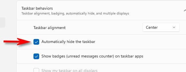 7、如果您想始终再次显示任务栏,请打开设置(键盘上的 Windows+i 将其快速拉起。),导航到个性化 》 任务栏 》 任务栏行为,然后取消选中“自动隐藏任务栏”。玩得开心!