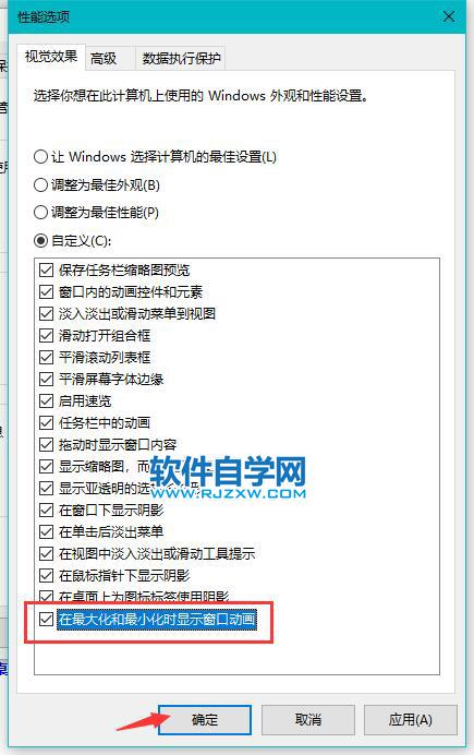5.在性能选项页面中,取消“在最大化和最小化时显示窗口动画”选项前的对号。
