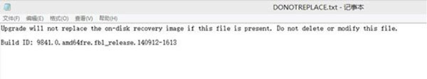 1、打开该文件夹,我们发现里面有一个名为“DONOTREPLACE”文本文件,告诉我们升级时不会覆盖这个“RecoveryImage”文件夹里面的恢复镜像,不要删除或修改此文件。除此之外,该文件夹里面还包含恢复介质以及关键驱动。