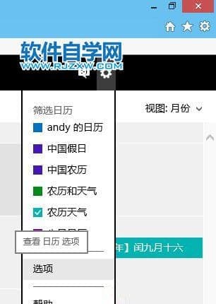 第1步、使用微软账号登陆微软日历网页,点击左上部粗轮状按钮,下拉菜单中选择“选项”。