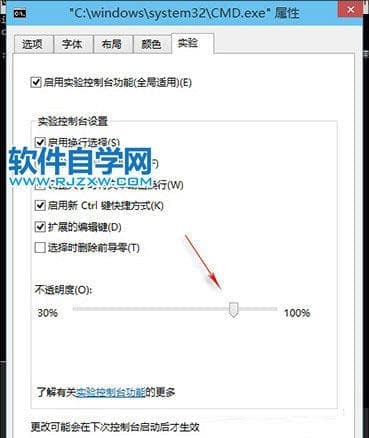 2、这项功能隐藏在属性菜单下的“实验”标签中,支持从100%调节到30%。启动命令提示符,在标题栏上单击右键,在弹出的菜单中选择属性,然后点击“实验”标签,这样就可以修改不透明度了。