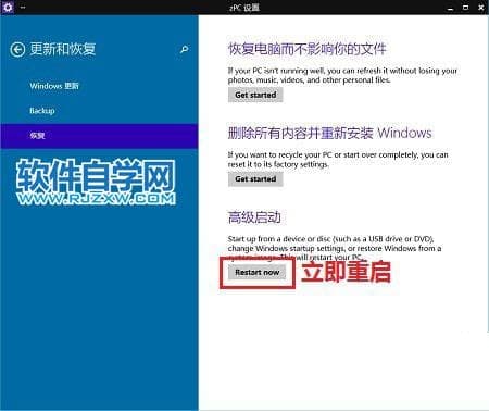 第3步、在更新和恢复界面,点击左侧恢复(Recovery),在右侧窗口找到高级启动(Advanced startup)项目下面的立即重启(Restart now),点击立即重启电脑。
