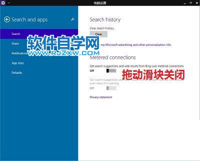 第4步、在搜索和应用界面,点击左侧搜索选项,在右侧窗口,将“Get search suggestions and web results from over metered connections(从Bing获取搜索建议和Web结果)”下面的滑块,使用鼠标拖动到“Off(关)”位置即可!