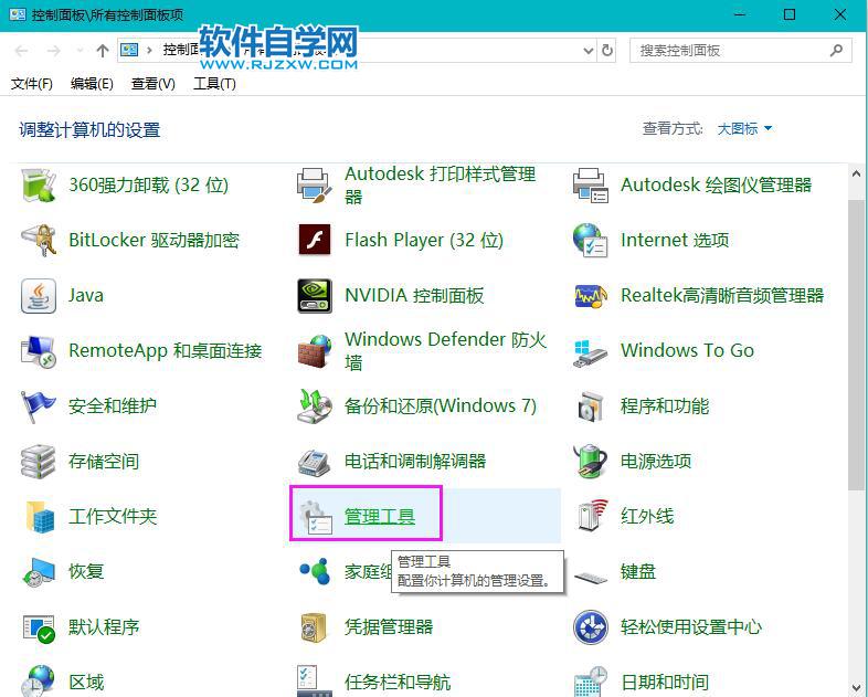 第2步、在控制面板大图标查看方式下,找到并点击“管理工具”。