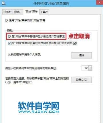 2、在任务栏和「开始」菜单属性对话框,点击选择“开始”菜单,在隐私项目下,取消“在‘开始’菜单中存储并显示最近打开的程序”的勾选,然后点击底部确定即可!