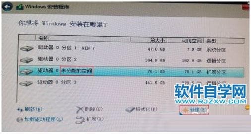 第1步、在安装WIN10的时候会到了安装到哪里这一步时可以在这里操作对硬盘的分区。对未分配的空间可以分区。点击新建。