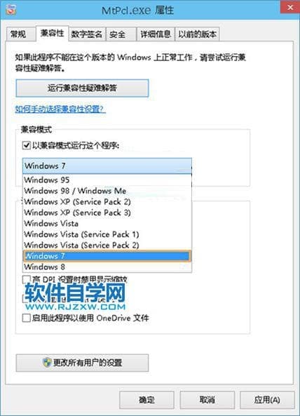 第2步、在文件属性对话框,点击切换到“兼容性”选项界面,点击勾选“以兼容模式运行这个程序”,然后点击下面的向下箭头,里面选择自己认为合适的系统版本,如Windows7(毕竟他的兼容性更好些),设置完成后,点击确定。