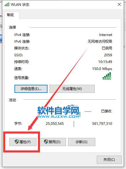 第5步、打开的WLAN状态界面以后,点击左下角的【属性】进入。