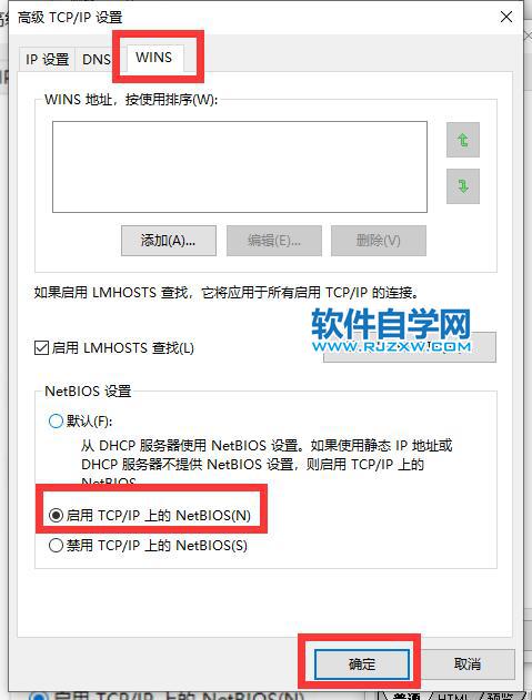 第8步、然后在上方标签栏中切换到【WINS】,然后勾选下方的【启用TCP/IP上的NetBIOS】,然后点击【确定】。