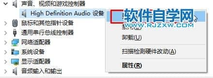 2、展开“声音、视频和游戏控制器”,在下面的声卡上单击右键,选择“更新驱动程序软件”进行更新驱动。