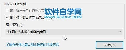 3、在阻止级别下拉菜单中选择【中:阻止大多数自动弹出窗口】,选择“关闭”。