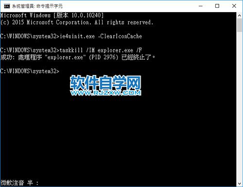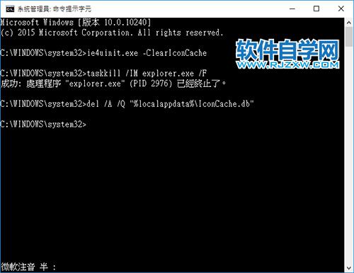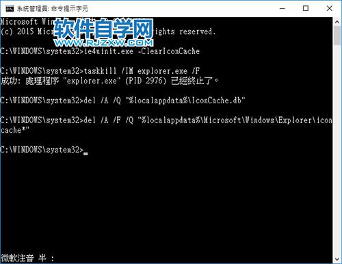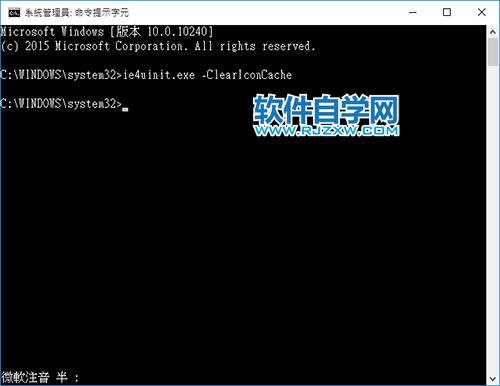 2、打开「系统管理员:命令提示字符」窗口以后,输入「ie4uinit.exe -ClearIconCache」并单击[Enter]。