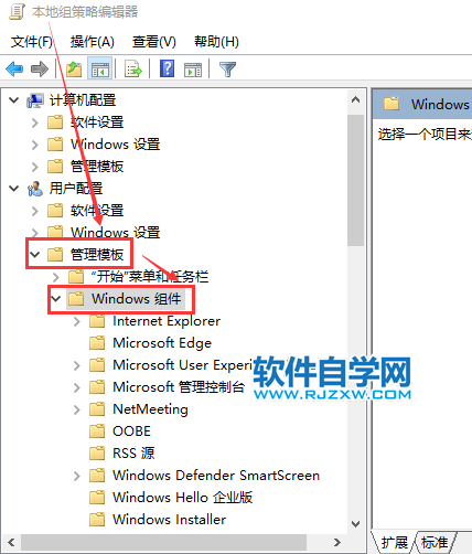 2、在打开的窗口“本地组策略编辑器”左侧找到“管理模板”,找到“Windows组件”点击展开。