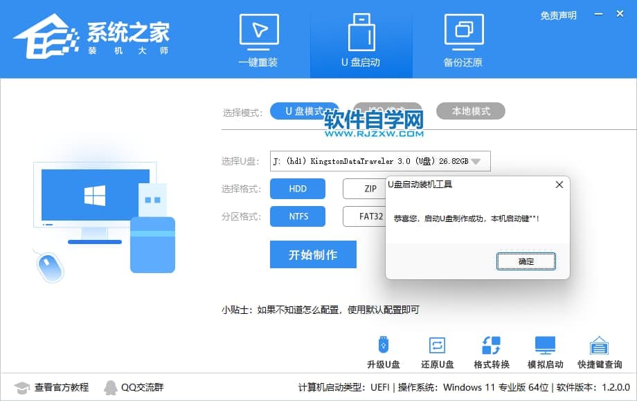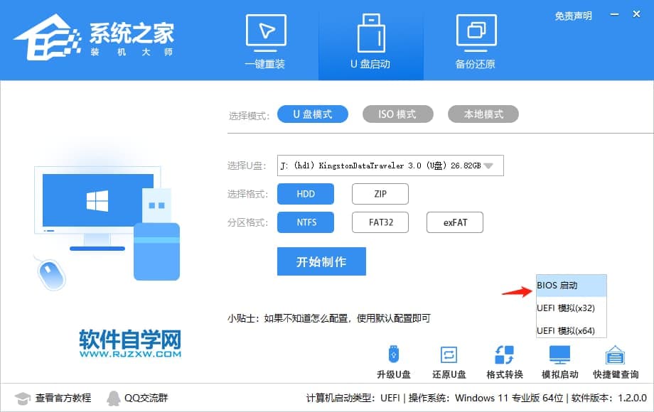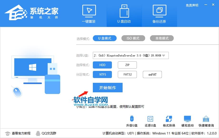 1)、进入工具后,在最上方选择U盘启动,保留默认的格式,点击开始制作。