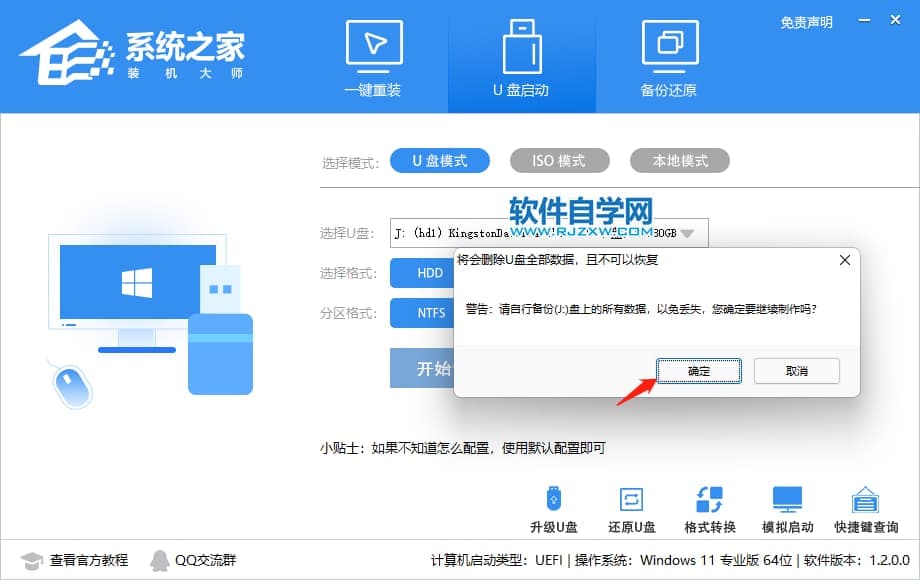 2)、工具会自动提示是否开始制作。注意:制作工具将会清理U盘中所有的数据且不可恢复,请提前存储U盘中重要数据文件。