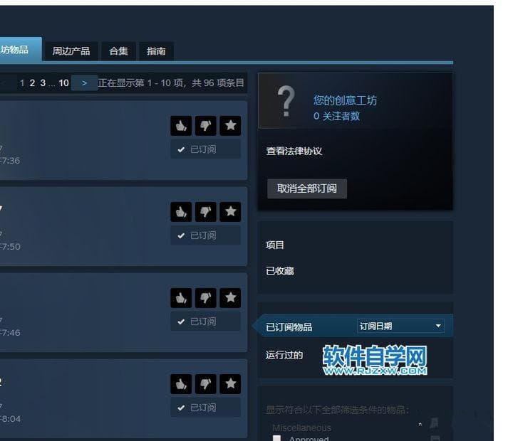 3、进入wallpaper engine的创意工坊以后,右边自己大头像下面,有一个“您的文件”,点击旁边的下拉小三角,选择“您的订阅”,以后会显示你云服务器上存储的订阅信息,点击旁边的“取消全部订阅”(要确保已经把自己需要的壁纸全部收藏了)。