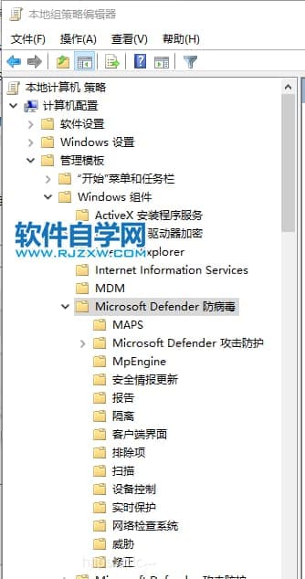 3、计算机配置→ 管理模版→ Windows组件 → Windows Defender防病毒程序;