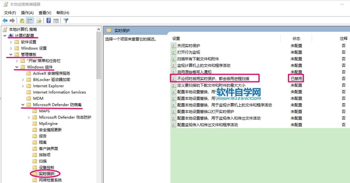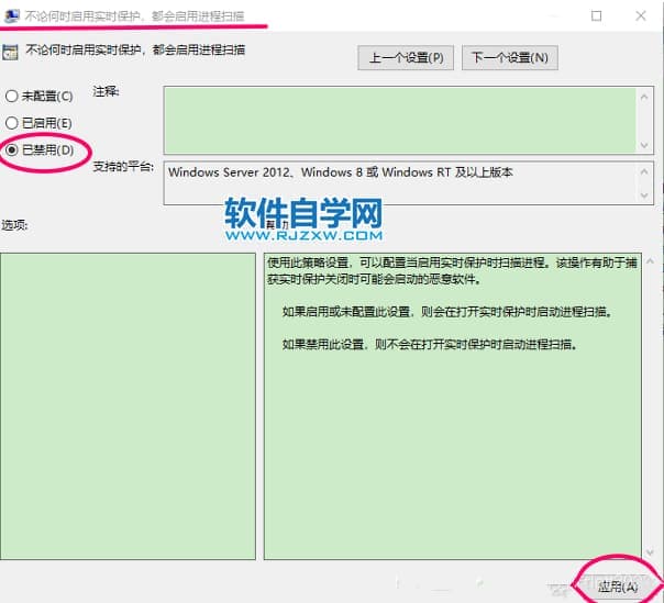 打开Windows Defender的“实时保护”,将里面的“不论何时启动实时保护,都会启动进程扫描”这一配置项设置为“已禁用”;