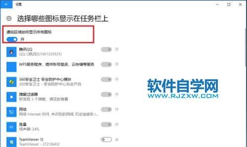 4、进去“选择哪些图标显示在任务栏上”界面后,可以看到已经显示在任务栏上的图标,可以选择哪些显示,哪些隐藏在系统托盘中,可以开启“通知区域始终显示所有图标”项。