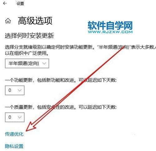 4、接下来我们可以在打开的Windows10高级选项窗口中,我们单击“传递优化”的快捷链接;