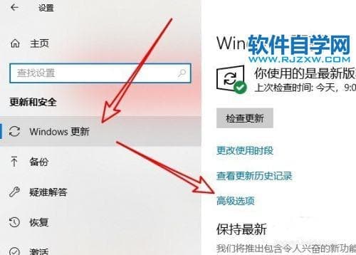 3、然后再开的窗口的界面中,我们点击左侧边栏的“Windows更新”菜单项,在右侧窗口中找到“高级选项”的快捷链接方式;