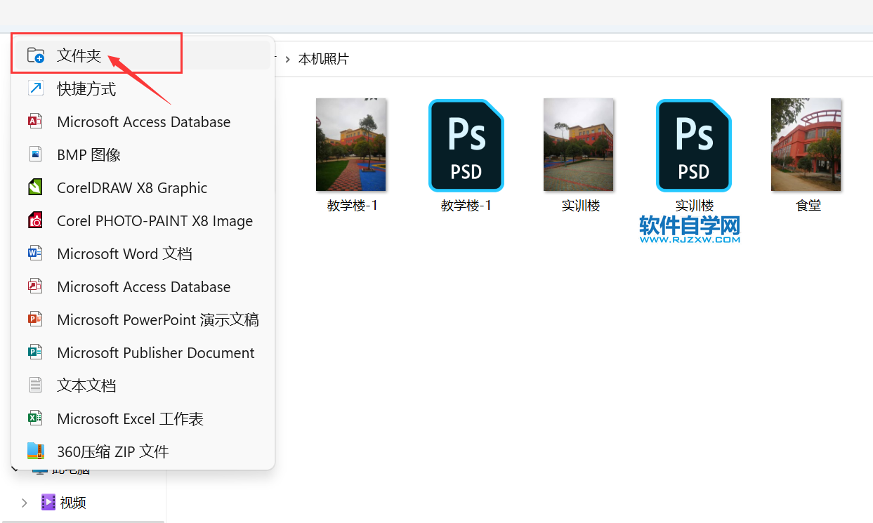 第4步、右击空白处,弹出对话框,点击新建。再点击文件夹。
