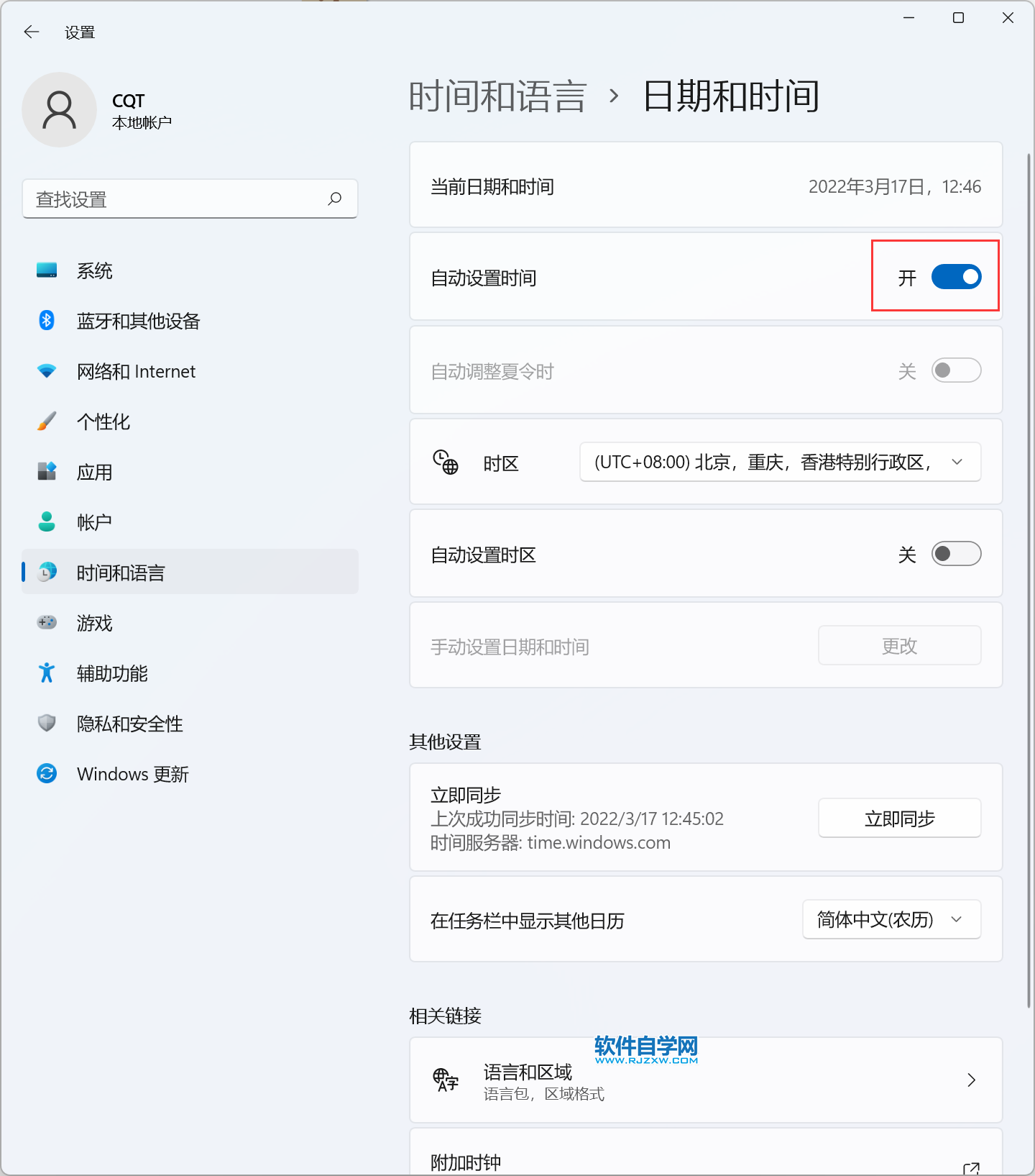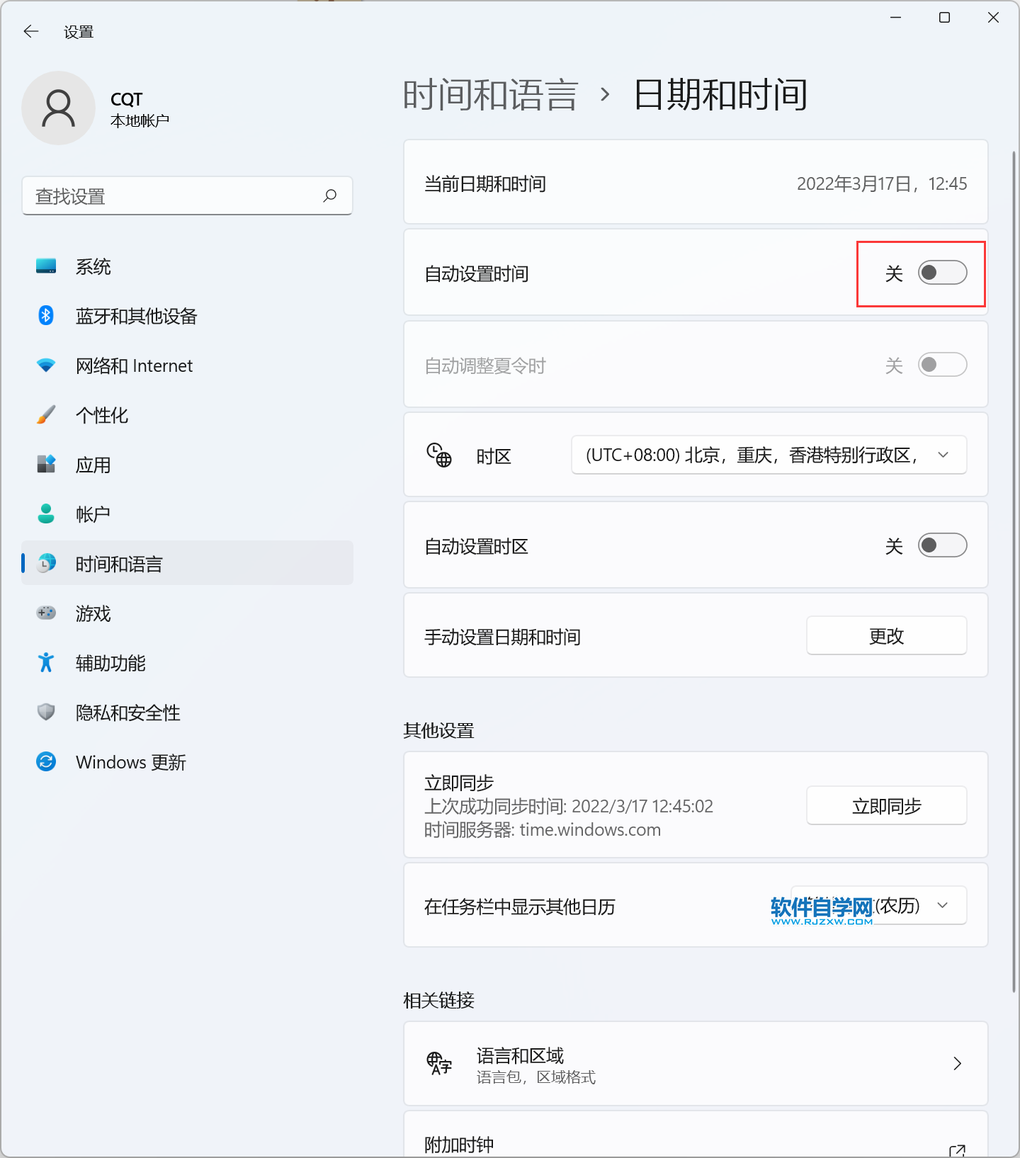 第5步、在自动设置时间的选项,看到的是关。如下图: