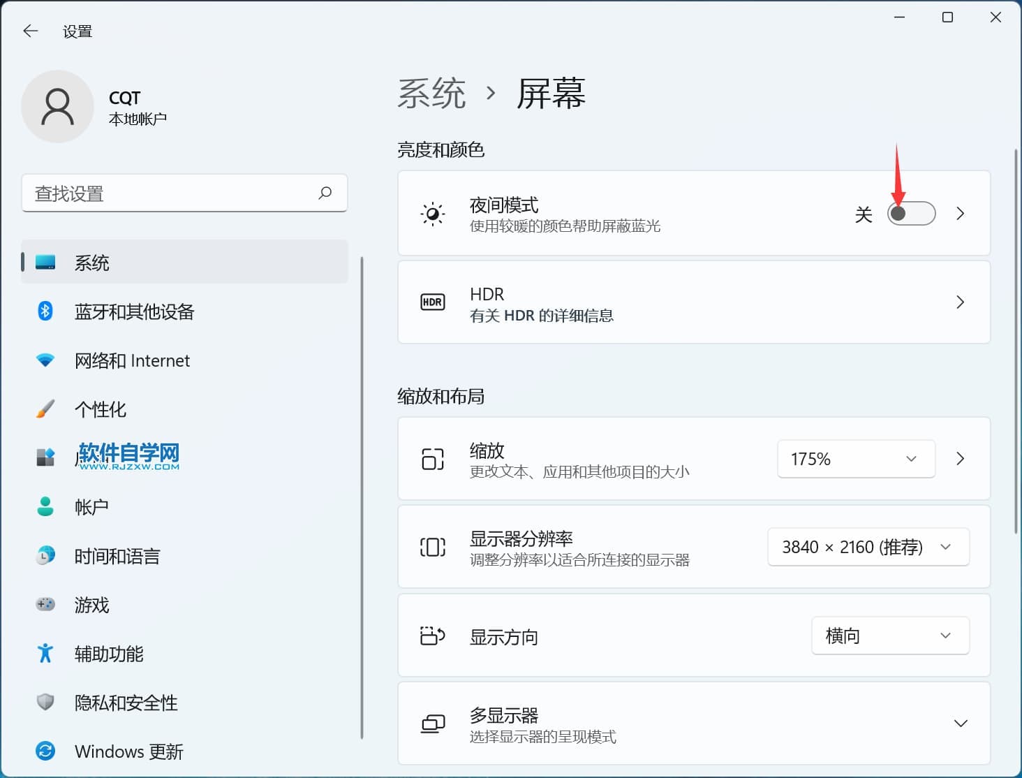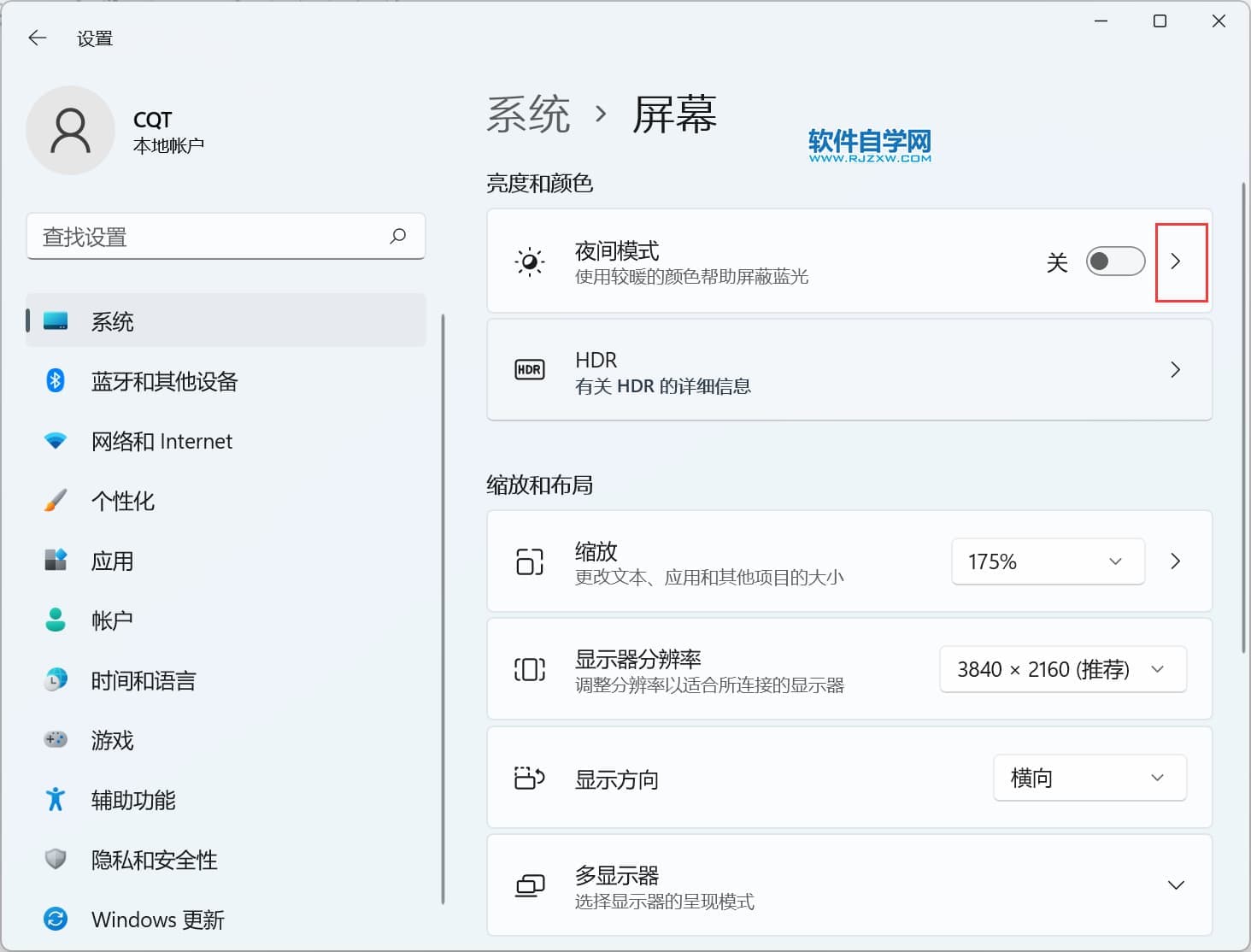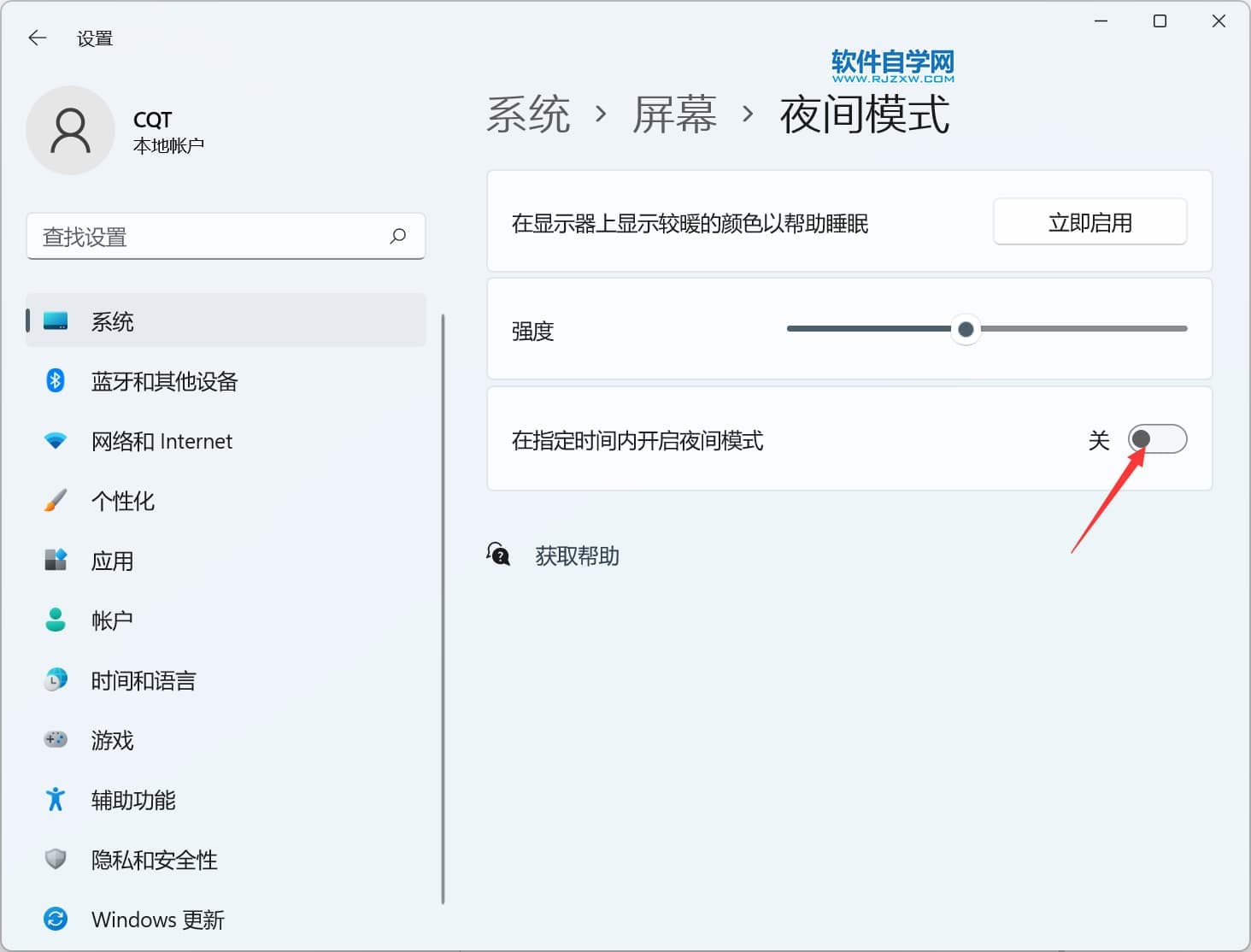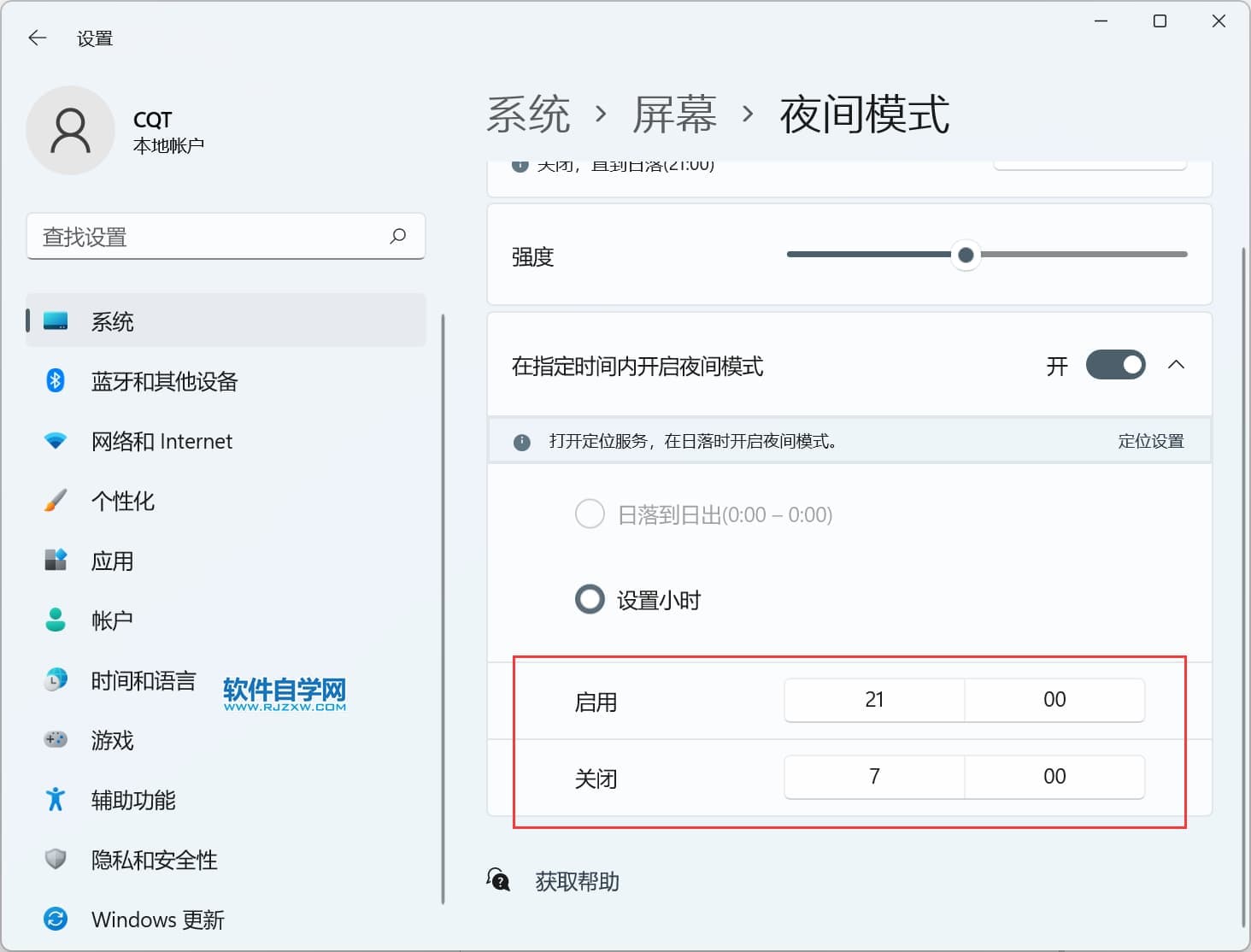 win11电脑怎么在指定时间内开启夜间模式 日期:2025-12-20 20:44:44 栏目:系统教程 浏览:4 评论:0 1、点击桌面上的开始图标。 2、点击设置。 3、点击系统,点击屏幕。 4、点击夜间模式。点击关。 5、点击夜间模式后面的箭头。 6、在指定时间内开启夜间模式,点击开。 7、然后就可以设置时间。 标签: #开启夜间模式 上一篇:半年工作总结2022(8篇) 下一篇:土木工程实习总结报告5篇 相关推荐 年度工作总结个人范文(精选10篇) 短消息的字数范围一般是() 保安年终个人工作总结 win自动设置时间怎么开启 评论留言 我要留言 ◎欢迎参与讨论,请在这里发表您的看法、交流您的观点。 昵称:* 邮箱:* 网址: 内容: 取消回复