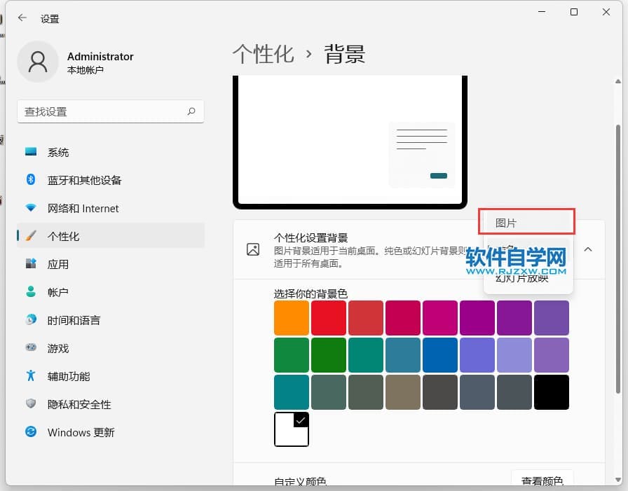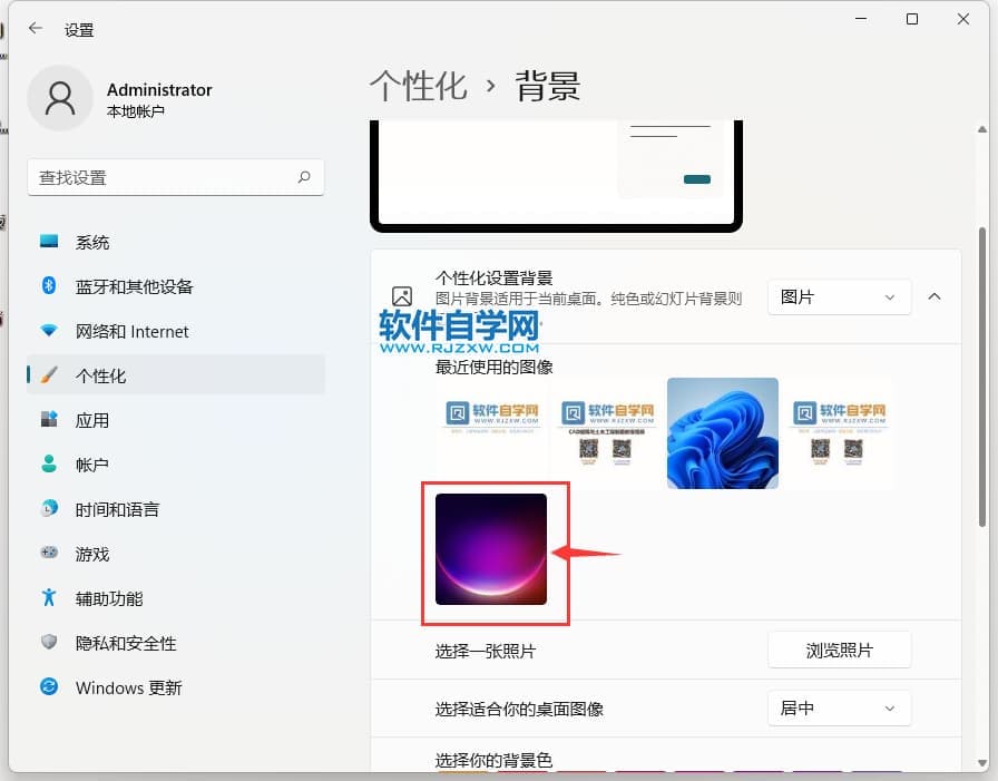 win11电脑怎么换电脑桌面图片 日期:2025-12-20 09:47:32 栏目:系统教程 浏览:3 评论:0 1、点击桌面上的开始菜单。 2、点击设置。 3、点击个性化。 4、点击背景,点箭头。 5、点击纯色中的箭头。 6、点击图片。 7、点击最近使用的图像。 8、这样桌面图片就换了。 上一篇:win11怎么开启晚上的夜间模式 下一篇:win10注册表怎么打开?win10注册表打开的四种方法 相关推荐 2022教师年度考核个人的总结7篇 win11怎么把整个系统文字放大 任务上的聊天图标怎么关闭 win的电脑怎么在桌面上显示控制面板 评论留言 我要留言 ◎欢迎参与讨论,请在这里发表您的看法、交流您的观点。 昵称:* 邮箱:* 网址: 内容: 取消回复