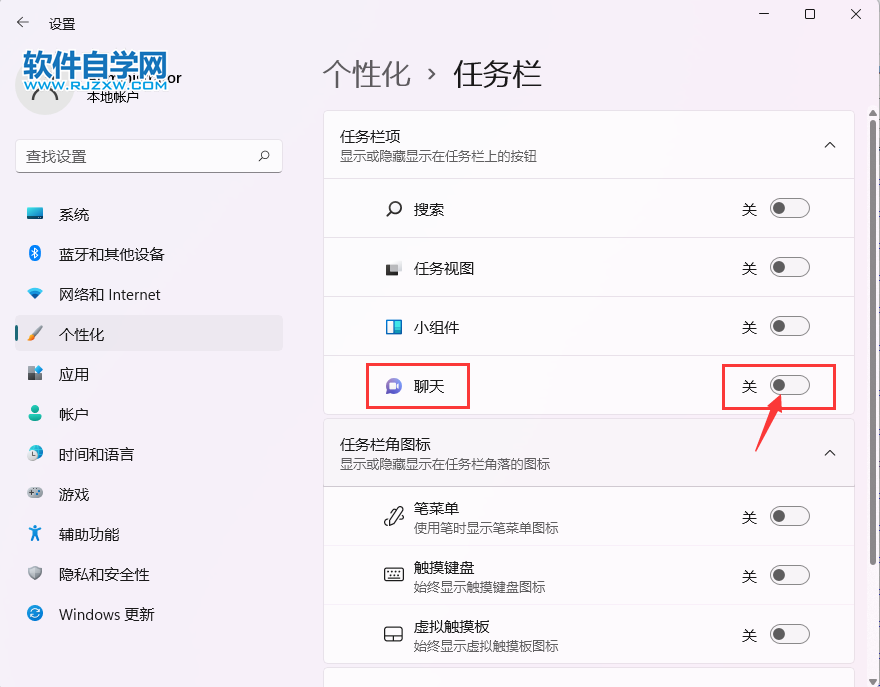 win11怎么显示视频图标 日期:2025-12-20 15:56:09 栏目:系统教程 浏览:4 评论:0 1、点击桌面上的开始图标。 2、点击设置, 3、点击个性化。 4、点击任务栏。 5、点击聊天后面的关。 6、弹出了聊天图标。 上一篇:2022上半年工作总结汇报10篇 下一篇:2022年简短的半年工作总结10篇 相关推荐 Win11电脑用命令窗口时中文乱码怎么办 AUTOCAD的坐标体系。包括世界坐标和( )坐标系。 无法打开Win11系统小组件的解决方法 工作总结怎么写范本10篇 评论留言 我要留言 ◎欢迎参与讨论,请在这里发表您的看法、交流您的观点。 昵称:* 邮箱:* 网址: 内容: 取消回复