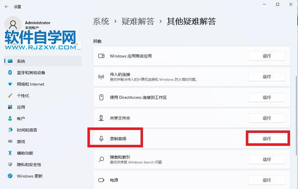 2、其他疑难解答页面,右侧往下拖动,点击其他下的录制音频后面的【运行】。运行后,系统就会尝试查找修复相关的问题。