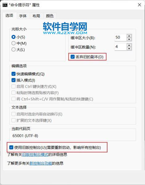 4、命令提示符 属性窗口,勾选【使用旧版控制台(U)(需要重新启动,影响所有控制台)】和【丢弃旧的副本】;