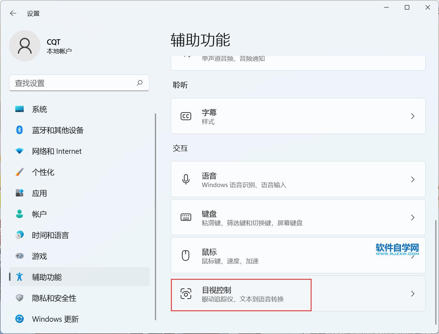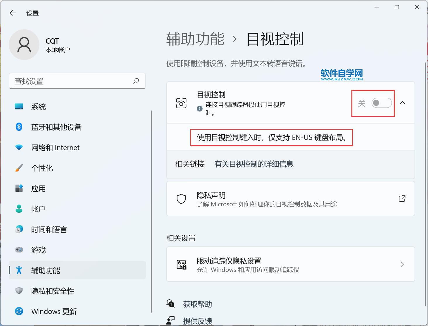 win11目视控制怎么开启 日期:2025-12-19 22:13:02 栏目:系统教程 浏览:2 评论:0 1、打开电脑上的开始图标。 2、点击设置。 3、点击辅助功能。 4、点击目视控制。 5、要连接了EN-US键盘布局。才能开始。 标签: #目视控制 上一篇:允许我的屏幕关闭怎么设置 下一篇:怎么打开win11控制面板? 相关推荐 怎么打开win11控制面板? win11目视控制怎么开启 允许我的屏幕关闭怎么设置 怎么查看病毒和威胁防护开启没有 评论留言 我要留言 ◎欢迎参与讨论,请在这里发表您的看法、交流您的观点。 昵称:* 邮箱:* 网址: 内容: 取消回复