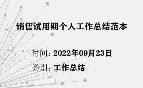 时间一晃而过,一段时间的工作活动告一段落了,回顾过去的工作,倍感充实,收获良多,是时候在工作总结中好好总结过去的成绩了。以下是小编精心收集整理的销售试用期个人工作总结范本,下面小编就和大家分享,来欣赏一下吧。